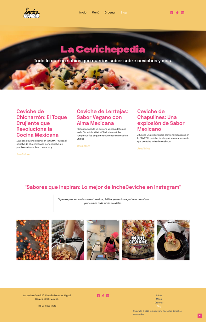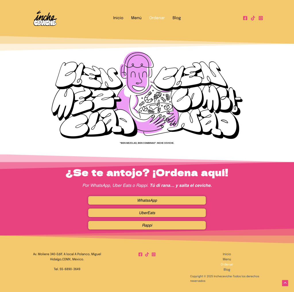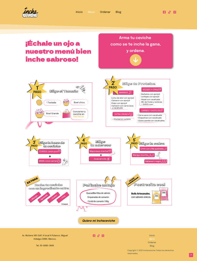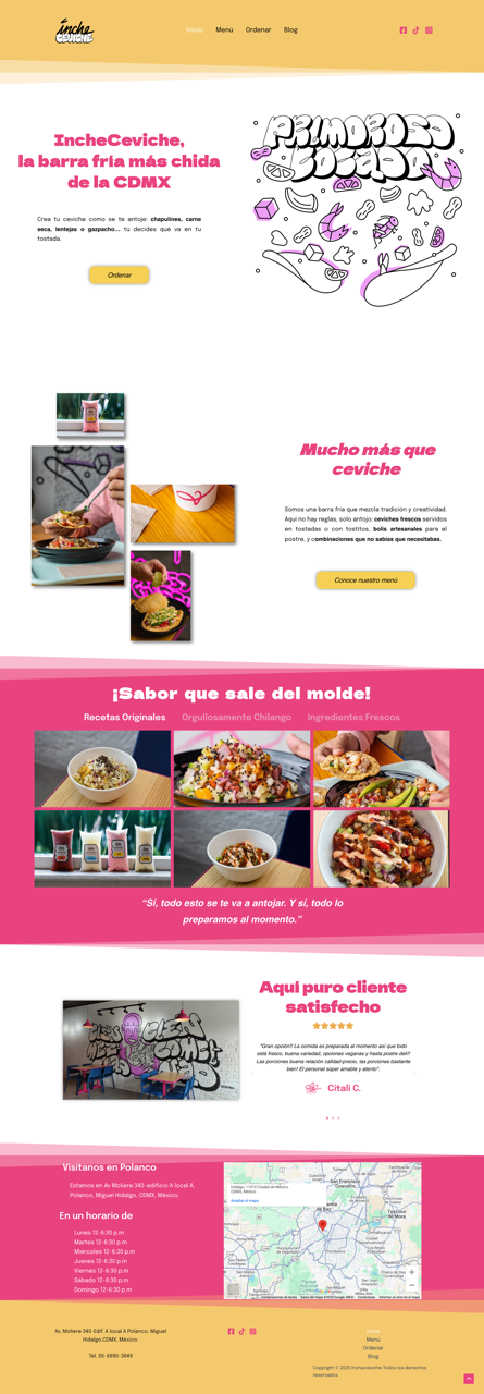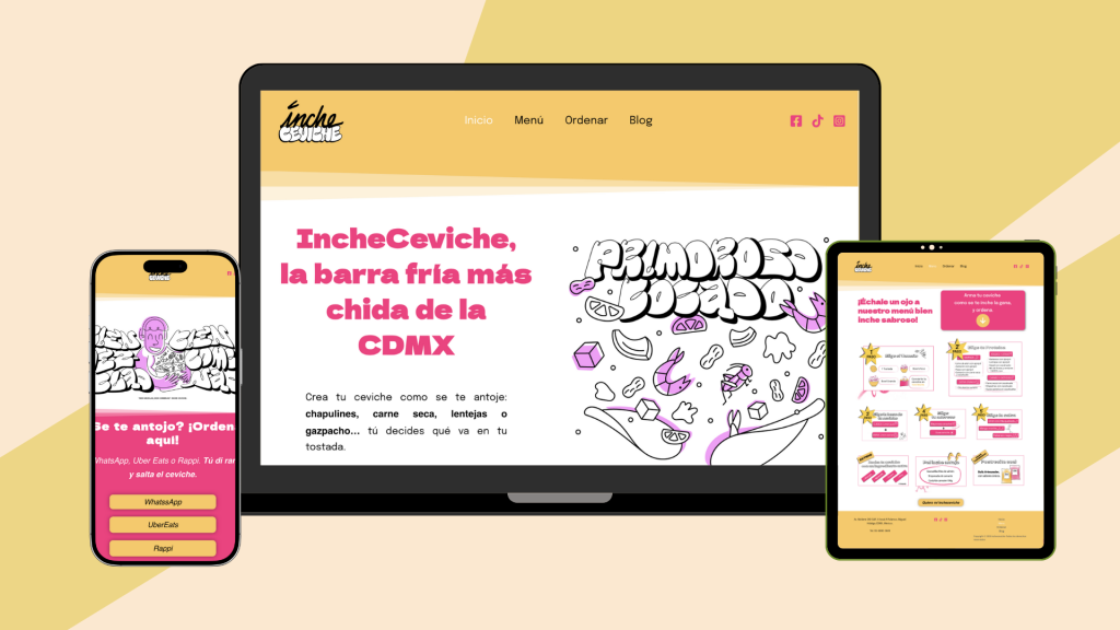 A modern, responsive website designed for IncheCeviche, a creative ceviche bar based in Mexico City. The site highlights their unique dishes, brand personality, and direct ordering links through a clean and vibrant interface.